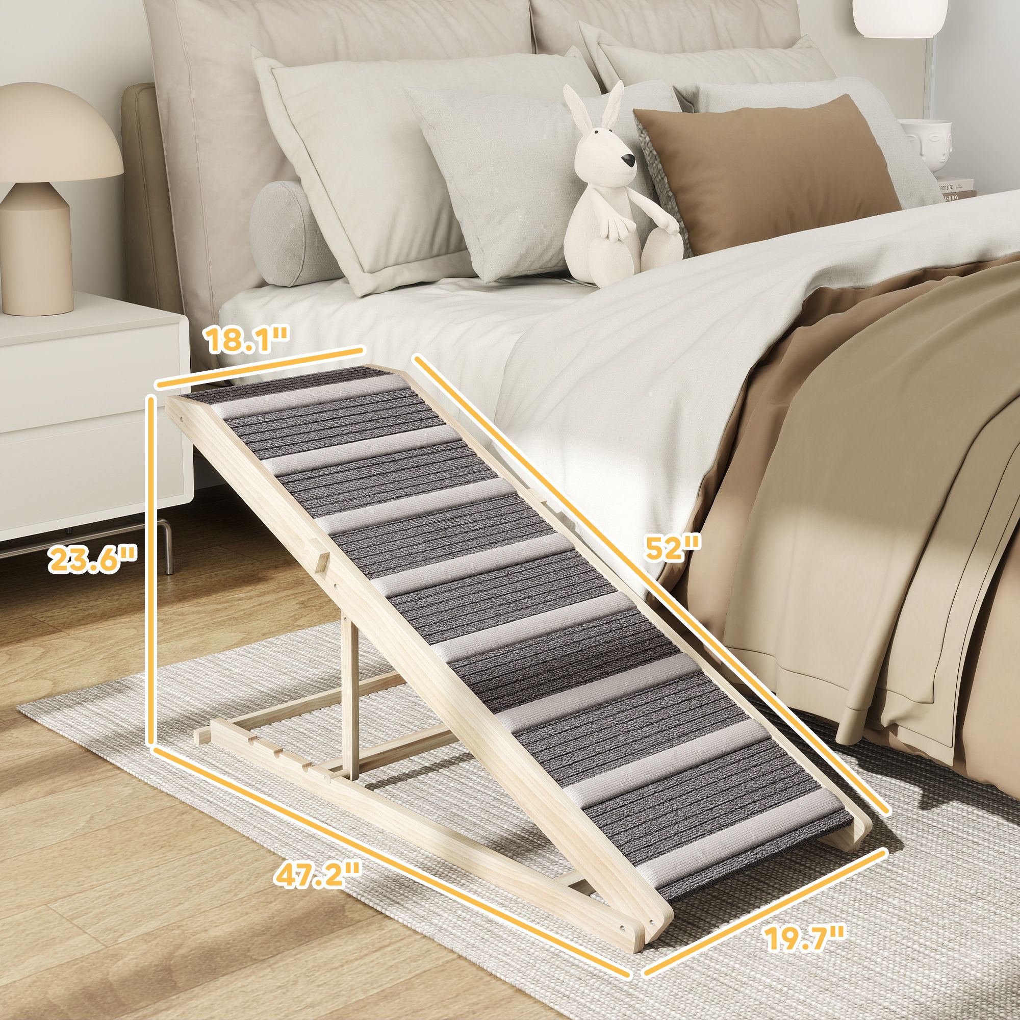 4.- Stable Wood Frame: Made from solid pine, this dog ramp for bed supports up to 110 lbs, ensuring medium and large dogs feel secure and relaxed during daily use