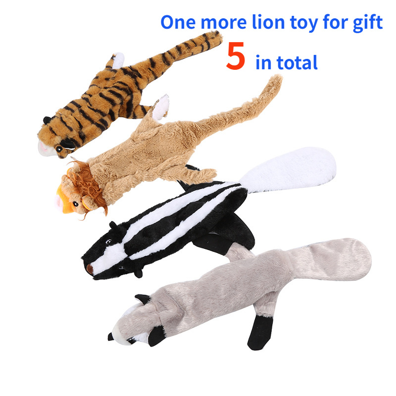 Plush Dog Squeaky Toys: This assortment value bundle plush pet toy contains 5 pack big woodland animals: raccoon squirrel tiger fox and lion. The funny and enrichment toys help dogs to exercise more and improve their health. They can do chewing and teething; tug of war games. Quality playing time together will also increase their bond with owner. It's the best gift supplies for dogs Birthday Christmas Halloween or any holiday